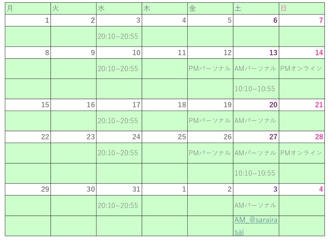 金曜日の夜、土曜日朝、に実施しています。体の調子、可動域の様子を見ながら個人に合わせたフローをご用意しています